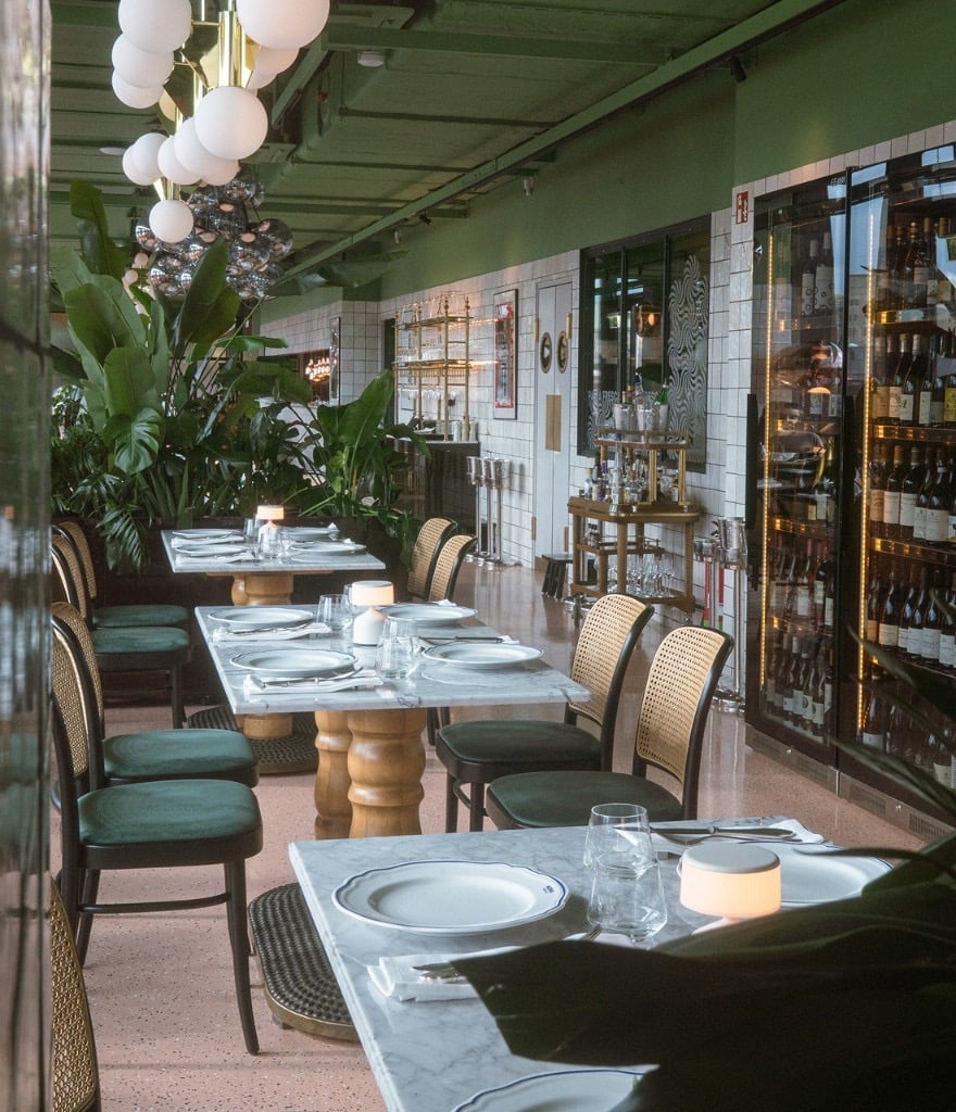 An exclusive private room with its terrace overlooking sunsets over the Spree, impeccable interior design, and tasty Italian food with a Levantine twist presented on bright Florentine Bitossi porcelain.